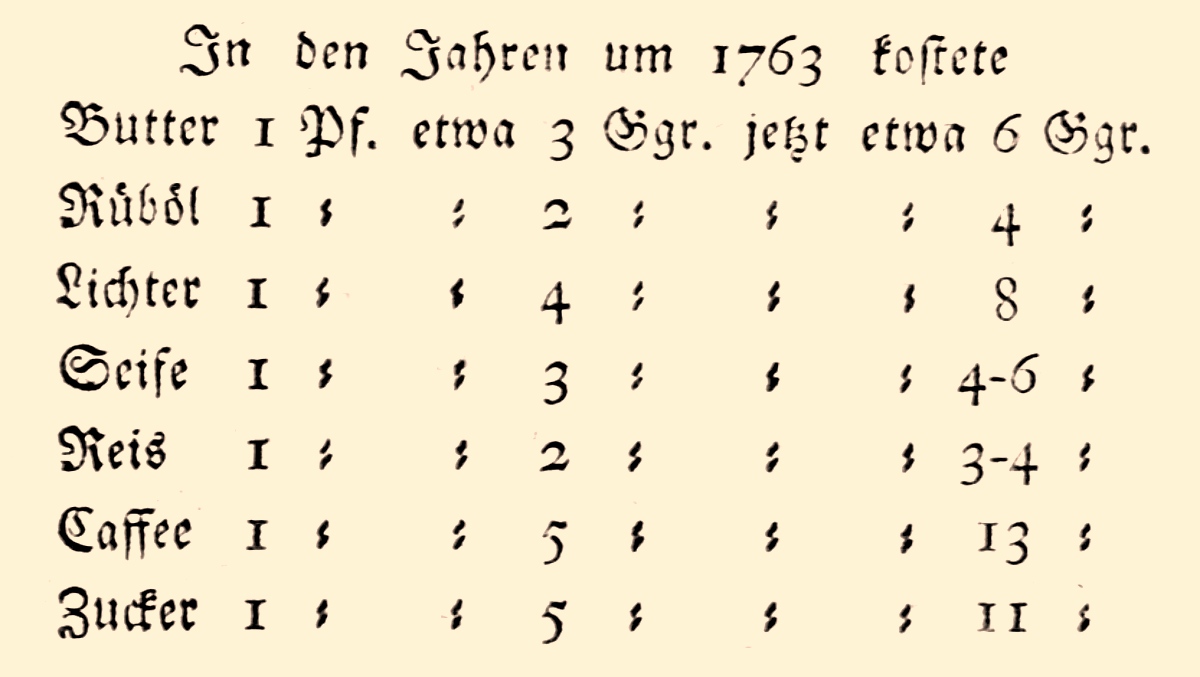 Um das Ausmaß der Teuerung zu illustrieren, vergleicht Piepenbring, wieviel jeweils ein Pfund (Pf.) verschiedener Waren (Butter, Rapsöl, Kerzen, Seife, Reis, Kaffee, Zucker) um 1763 und im Erscheinungsjahr seines Buches, also 1798, kostete.