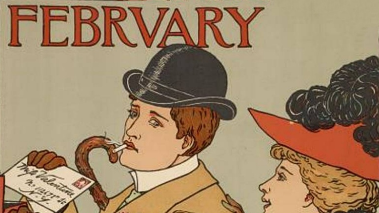 Dieses Februar-Kalenderblatt aus dem Schaltjahr 1896 stammt aus den Vereinigten Staaten. Dort war es, wie auch in England, seit der Mitte des 19. Jahrhunderts ein weitverbreiteter Brauch, am 14. Februar, zum Valentinstag, Grußkarten zu verschicken.